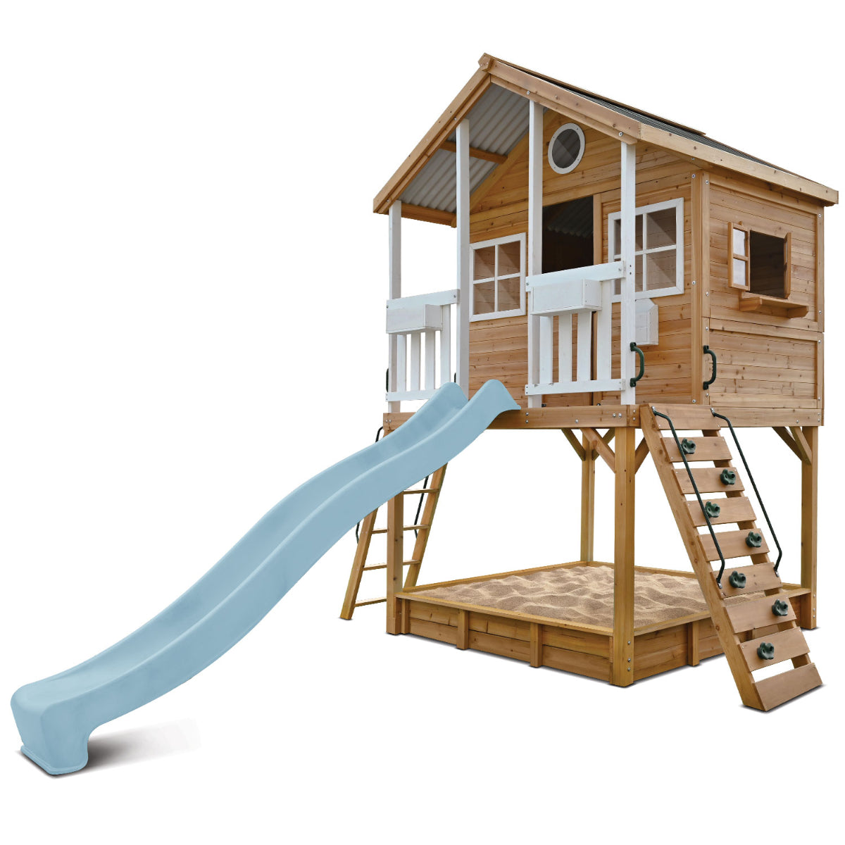 Transform your backyard into a magical realm with the Winchester Cubby House featuring the Elevation Kit and 3m Slide. This enchanting playhouse is designed for endless adventure, boasting a host of exciting features that will captivate your little ones. The Elevation Kit includes a slide, rock climbing wall and ladder, while the inbuilt sandpit below sparks creativity and sensory play. The metal roof ensures superior durability and wear resistance, providing a reliable shelter for years of outdoor fun. Delight in the casement windows on the side, equipped with perspex plastic panels that can be opened outward, allowing for fresh air and a great view. The charming barn door completes the look, inviting imaginative play.