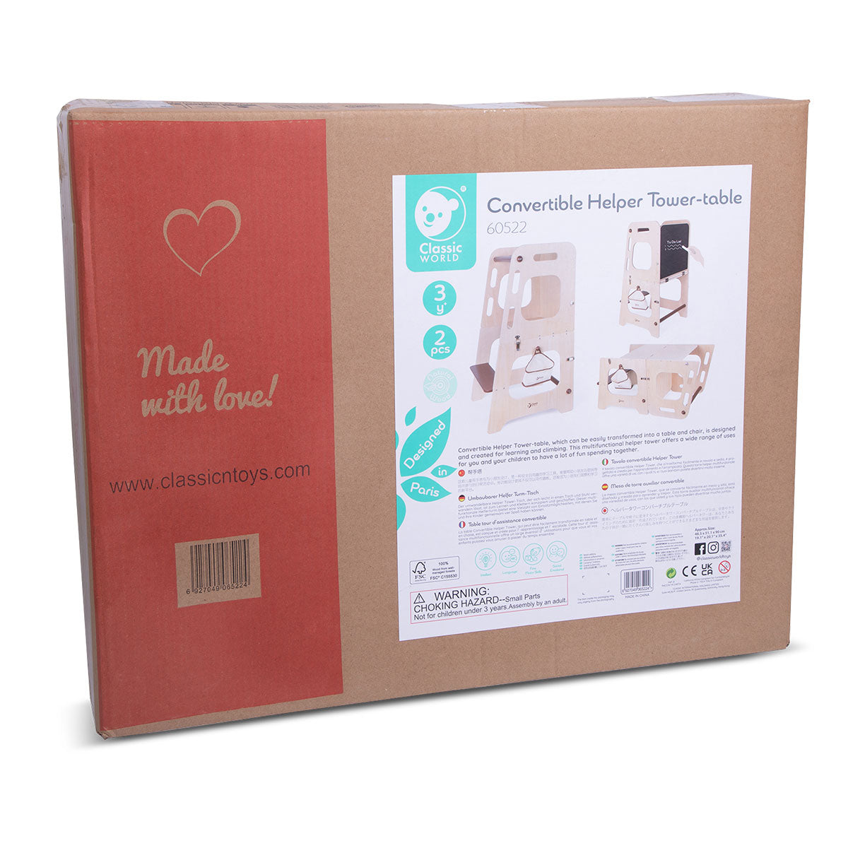 The Classic World Convertible Helper Tower-Table is the perfect companion for growing, curious kids. Transforming from a step-up tower into a functional table and chair, it’s perfect for helping, creating and learning every day.